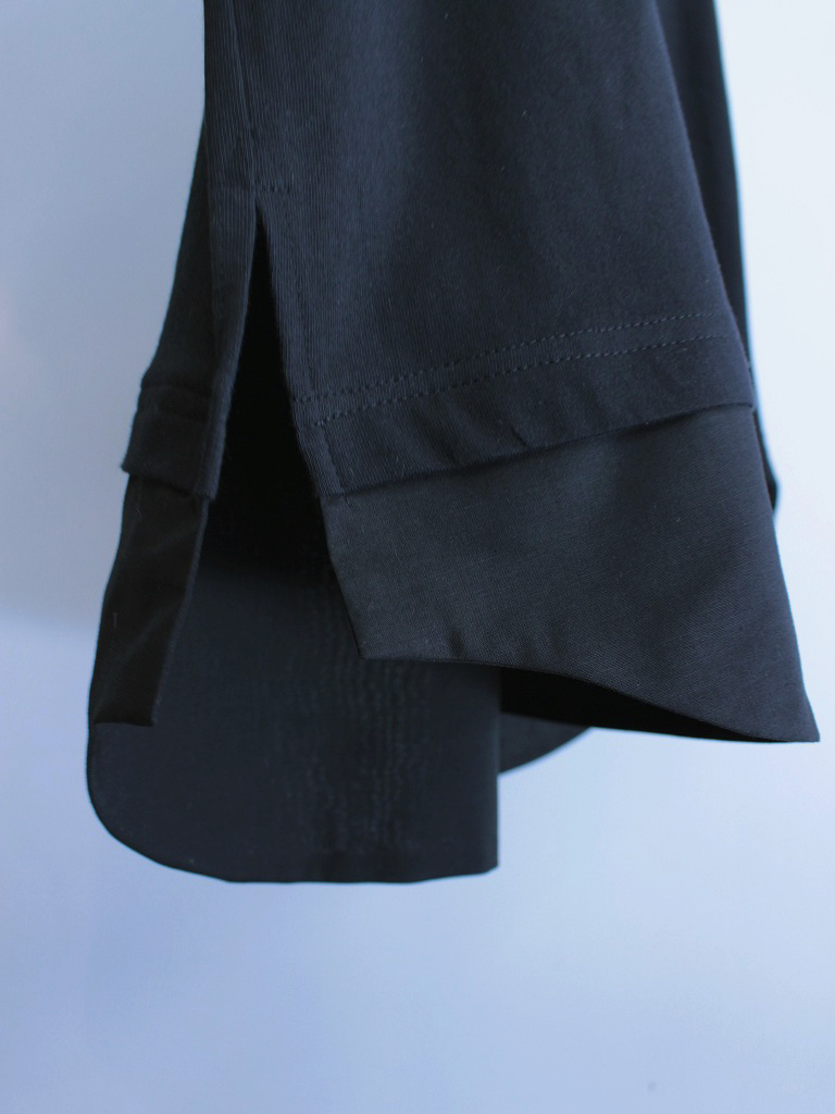 バギーTEEのシルエットをやや絞り、サイドスリットと裾にシワになり難い高密度表面シャーリング布帛ブロードの切り替えが付いたレイヤードデザインのプルオーバーです。